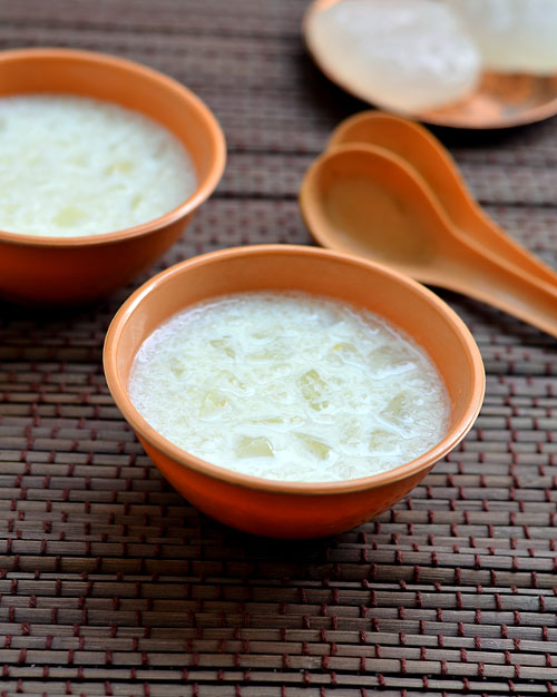 Nungu Paal Payasam is a refreshing and unique South Indian dessert made with nungu (ice apple), milk, and sugar. The soft, translucent fruit is mixed with sweetened milk and flavored with cardamom, creating a light and cooling treat, especially popular during the summer months. It's a delicious combination of textures, with the mild sweetness of the nungu complementing the rich, creamy milk.