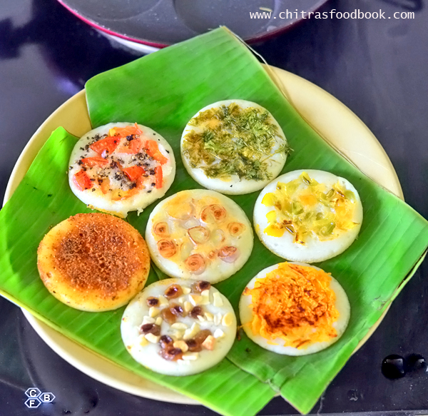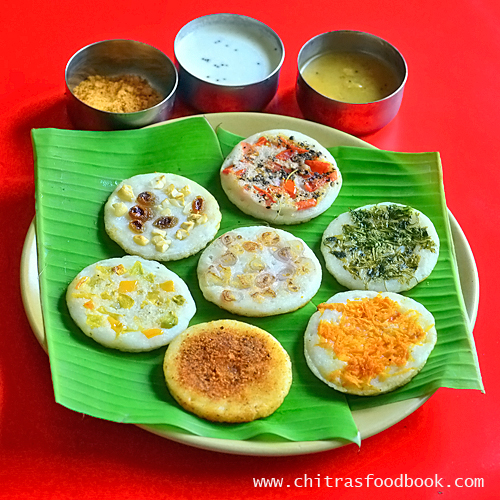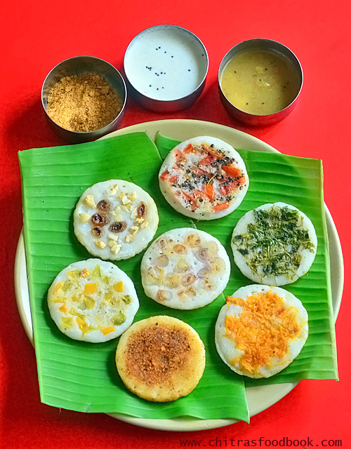 I have used onion, carrot, capsicum, coriander leaves, tomato + crushed pepper, Idli podi / Gun powder, dry fruits and nuts toppings. You can skip any two and make 5 taste uthappam. For variations, you can use paneer bhurji, grated cheese, chocolate chips even finely cut apple for different and interesting toppings.