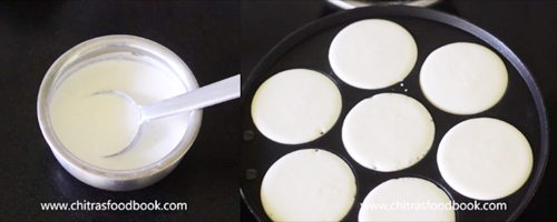 - Heat a dosa pan or uthappam pan. Pour small ladleful of batter. Do not spread it.
