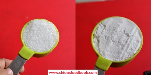 - Powder 1/2 cup + 2 tbsp sugar and measure 1 cup from it. Set aside.