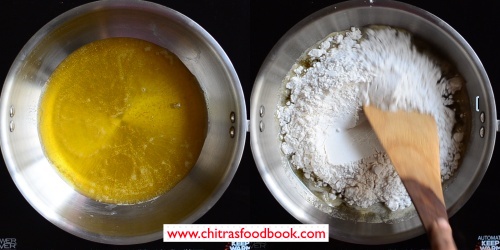- Heat ghee in a kadai for few seconds. Add maida and roast in low flame for 8 to 10 minutes without changing the color.