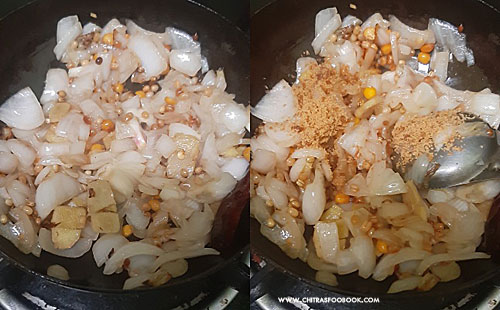 - Add the cubed onion, sliced ginger pieces. Saute till onion turns transparent.