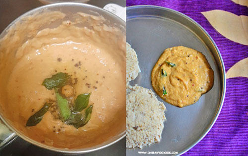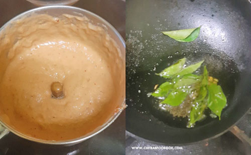 - Switch off and cool down. Add tamarind, jaggery, salt and grind everything to a smooth, thick paste.