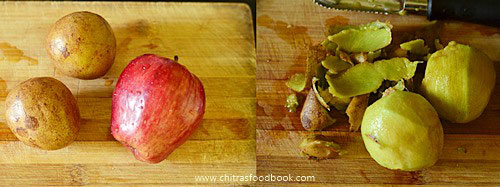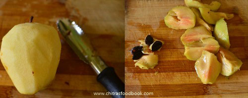 • Wash and peel the skin of apple and sapodilla/ sapota using a peeler. Chop into big cubes and remove the seeds.