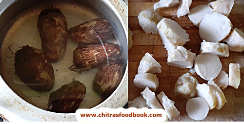 - Wash the arbi and pressure cook for 1 whistle in low flame.