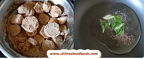 - Mix gently. Add arbi, cooking oil and coat well. Heat oil and temper the ingredients.
