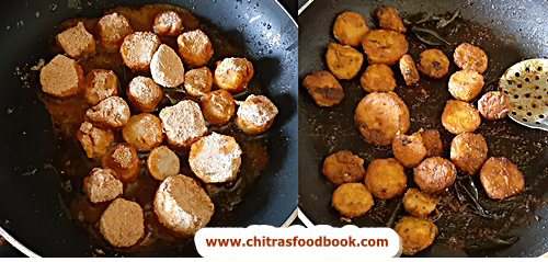 - Arrange the arbi and cook in medium flame till golden on both sides.