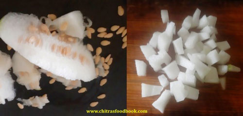 - Wash and peel the skin of Ash gourd. Remove the seeds and flush part in the middle. Chop into cubes. Set aside.