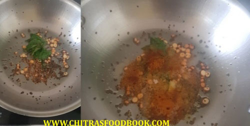 - Heat oil in a kadai. Splutter mustard seeds, urad dal, cumin seeds, curry leaves and hing.