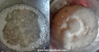 - Boil jaggery and melt it. Strain the syrup and boil till frothy and thick.