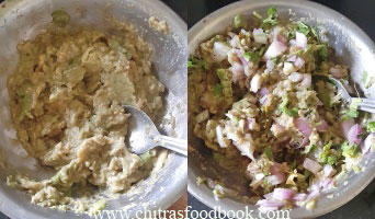 - Mash the pulp and add finely chopped onion, coriander leaves, lemon, green chilli and salt. Mix well.