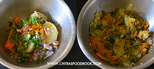 - Add boiled carrot, boiled green peas to the potato. Add spice powders, chopped onion, green chilli, coriander leaves, ginger garlic paste, cashews, tomato sauce and salt.