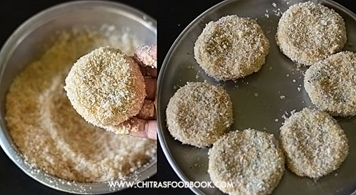 - Take the cutlet dough. Make round, heart or oblong shapes. Arrange in a plate. Dip in Maida paste and then in bread crumbs. Arrange in a plate.