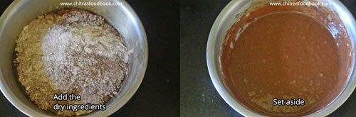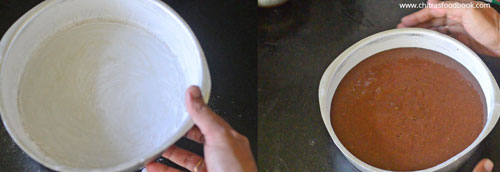 • The consistency of batter should be thin and falls like a thin ribbon. Pour the batter and pat the pan for even distribution of flour. Keep it ready.