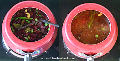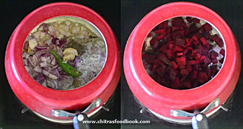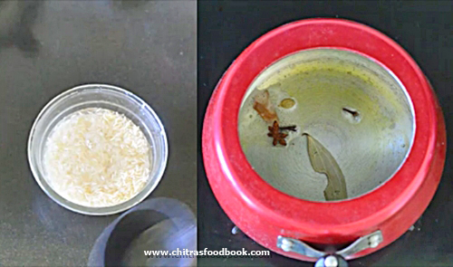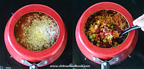 - Saute for few minutes. Lastly add water, soaked rice, salt and pressure cook for one whistle in low flame.