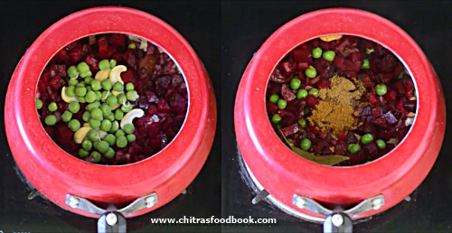 - Now add the chopped beetroot, green peas. Saute for a minute. Add turmeric powder, dhania powder and garam masala powder.