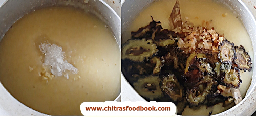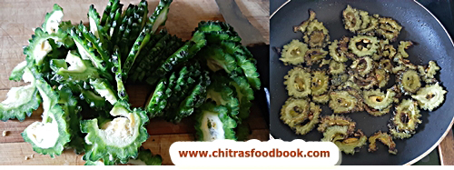 - Wash and chop bitter gourd slices thinly. Heat oil and saute the slices till its completely cooked and shrink in size. Remove in a plate.