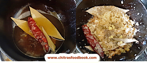 - Temper mustard seeds, bay leaf, red chilli, grated coconut, half of ginger paste and saute for few minutes.