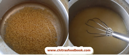 - Lastly add the cooked moong dal, salt, sugar and required water.