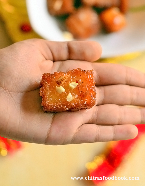 When I googled for images, I found bread kaja looks triangle in shape similar to Shahi tukra. But I made in small squares to attract the kids. Its an interesting recipe to empty the leftover bread slices. You can make and consume it immediately for crispy tasting bread OR you can soak the fried bread slices in sugar syrup overnight and enjoy like bread gulab jamun. It tastes so soft and flavorful. In fact I loved the soft and well soaked bread pieces more than crispy ones. Ok friends, do try this yummy, easy bread kaja sweet recipe for this new year 2020 and share your feedback with me.