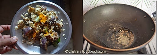 • Cook brinjal adding the required water, salt , tamarind extract and sambar powder. Make sure the brinjal is not over cooked. It should retain its shape. After the brinjal is cooked well, remove and drain the excess water. U can use this water for making sambar. (I usually pressure cook the brinjal along with dal by keeping it in a separate bowl inside the cooker. I keep it after the cooker starts steaming so that by the time it whistles, brinjal will be cooked properly without losing its shape).