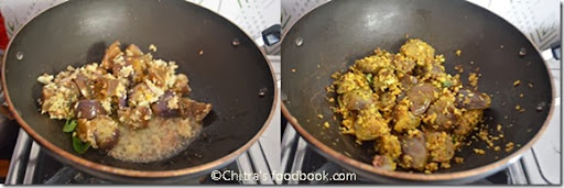 • Add the brinjal mixture and mix it well. Make sure brinjal doesn’t break. Simmer the flame and allow it to roast in oil till all the moisture leaves it. It gives a nice masala smell. Takes nearly 10-12 mins in low flame to get ready. Flip every now and then to avoid burning in the bottom.