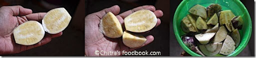 • Cut brinjal into two vertically. Again cut this into two cubes. Soak in water till use to prevent color change.