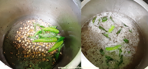 - Saute green chilli, ginger, curry leaves. Add hing, required water and salt.