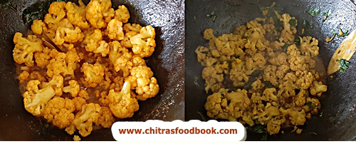 - Mix quickly and add the cauliflower florets, required salt. Mix well.
