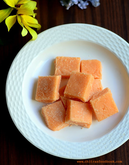 I adapted this recipe from an old magazine.Its a quick and easy to make burfi recipe.This burfi is made of milk powder and maida.I used Amul milk powder. Just a drop of ghee is used to grease the plate. As I tried this for the first time, I used minimum quantity of ingredients.It came out very well.It was so soft with nice flavor.I got 10 small pieces.Do try this easy burfi recipe for this Diwali and enjoy ! Soon I will share my MIL’s Maida burfi/Maida cake recipe.