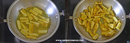 - Heat oil in a kadai. Add the raw banana pieces in batches and shallow fry till light golden in color. Remove in a plate.