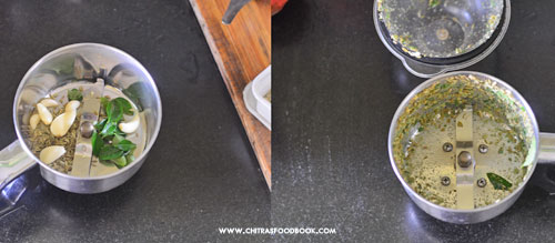 - Grind fennel seeds, curry leaves, garlic to a coarse paste and set aside.