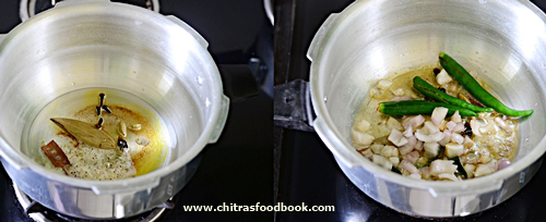 - Saute whole garam masala, fennel seeds. Add onion, green chilli and saute well.
