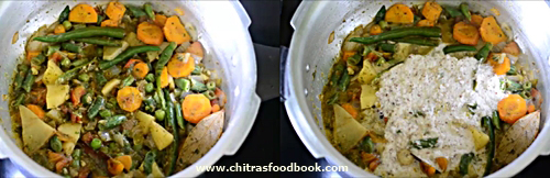 - Add paste 1 and saute for a minute. Add vegetables, salt and mix well.