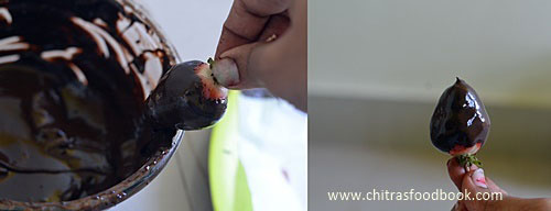 - Wash & pat dry the strawberries completely. Make sure strawberries are completely dry because chocolate will not be coated over wet strawberries.