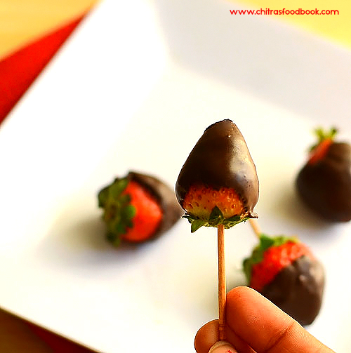 This year, when I was thinking about Valentines day recipes, my friend Shalini told me about this Chocolate covered strawberries ( Strawberries dipped in chocolate sauce). I browsed for this yummy dessert recipe & found it is a traditional gift for Valentine’s Day in the United States. I became double happy & tried it this morning to start off Valentines day special recipes in my blog.
