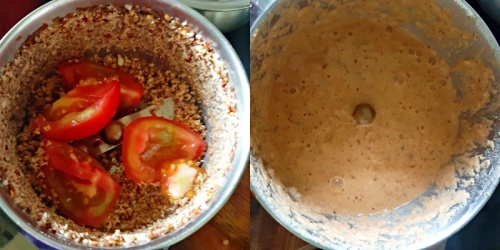 - Lastly add one chopped tomato and grind to a smooth paste. Set aside.