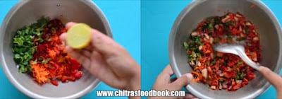 - In a wide bowl, take the finely chopped onion, tomato, grated carrot, coriander leaves, lemon juice, red chilli powder, salt and coconut oil. Mix well.