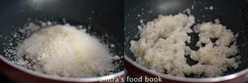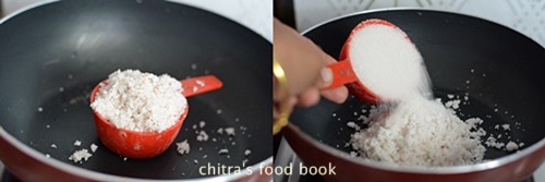 - In a wide non-stick kadai, take the grated coconut, sugar, milk and rava (if using). Switch on the flame, keep it medium and mix it.