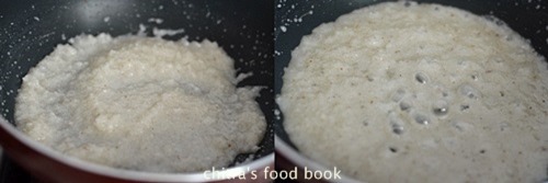 - As u mix,sugar will melt and the mixture becomes watery. Keep the flame completely low and keep mixing the coconut mixture ( Mixing in low flame is the second important thing to get white burfi). White foamish bubbles will form all over the mixture. Keep stirring the mixture by staying nearby. Mixture will start to become thick. Bubbles will form in the sides of the pan and mixture will leave the sides of pan.