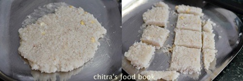- Press and level the mixture with back of spatula or butter paper. Then leave it untouched for 2 minutes. Now draw lines using a sharp knife and mark squares or diamond shapes. Let it cool. Remove and enjoy ! U can store this burfi in a box and use it for a week.( Initially burfis look half white but it changes to white as time proceeds)