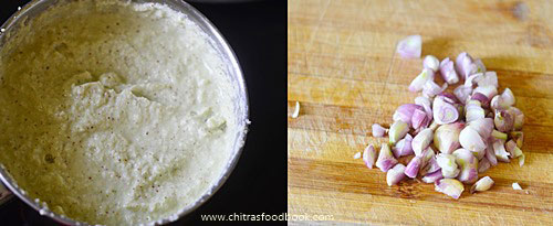 - In a mixie jar, take the grated coconut, green chilli, tamarind and salt. Add required water and grind to smooth paste. Set aside. Peel and chop onions roughly.