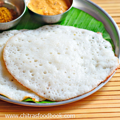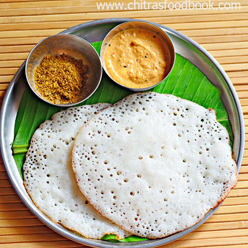 Last week when I was looking for dosa batter recipe without urad dal, I came across this coconut dosa in Veg recipes of Karnataka blog. I loved its soft and porous texture. So I tried it by doubling the recipe. As expected, it came out very well. We all loved it. I served it with red coconut chutney and garlic chutney. Both went well with this dosa.