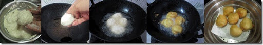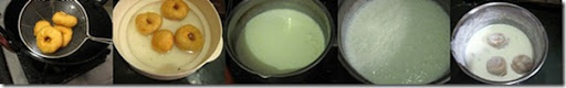 - Keep the warm water ready in a bowl. Heat oil in a kadai and take a tbsp of batter and drop in the oil. OR u can take a small ball shaped batter and drop in the oil. U can make it in vada shape / donut shape too. Deep fry in both sides till golden brown. Remove and add it immediately to the warm water bowl.