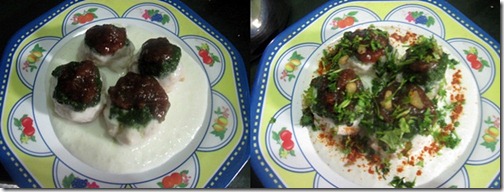 - In a serving plate , arrange 4-5 balls and pour the curd over them.Now put 1/2 tsp of green chutney & 1 tsp of sweet chutney over each ball. Sprinkle the red chilli powder , cumin powder and finally sprinkle the ginger bits,coriander leaves & if desired oma podi..