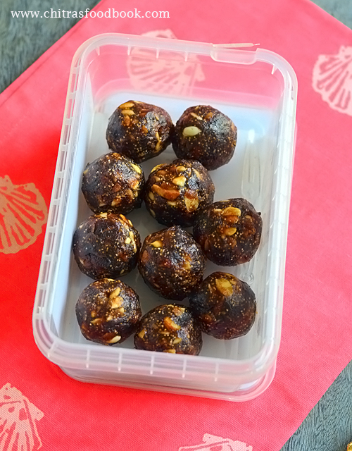 To start with this year’s Diwali recipes, here is an easy and simple, sugar-free Dates nuts laddu recipe. This recipe is similar to Dates and nuts roll I posted few years back. But its procedure is much easier than dates roll. I tried this with the leftover pack of dates. It tastes so good and flavorful too. With a nice flavor of ghee and crunchy taste of nuts, this dates ladoo is sure a healthy choice for kids and adults with good calories. Use soft dates (Medjool dates) if you like soft ladoo or use regular, hard dates like Lion dates for slightly, chewy and hard ladoo. Its your choice finally. Chopping the nuts is little time consuming otherwise this ladoo can be prepared in few minutes. If you want to ease this chopping job, you can grind coarsely and then roast it. Friends, do try this healthy, sugarless sweet for this Diwali and enjoy ! Lets see how to make dates and nuts ladoo with step by step pictures.