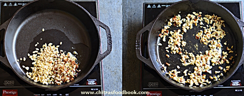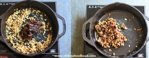 - Heat 1 tbsp ghee in a kadai and roast the nuts.