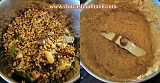 - Take everything in a mixie jar. Add salt, tamarind, jaggery and grind everything to a coarse powder without adding water. Add little water and grind to thick paste.
