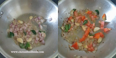 - Saute finely chopped onion till transparent. Add tomato and saute till mushy.