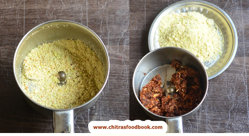 - Heat 1 tsp ghee in a kadai. Roast the nuts till golden. Grind coarsely.